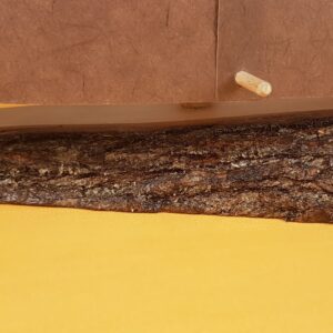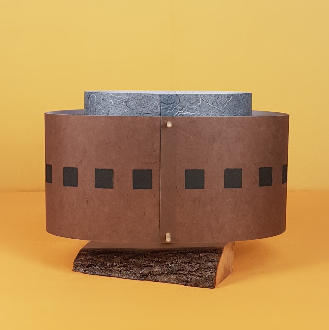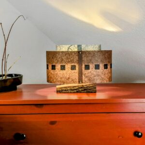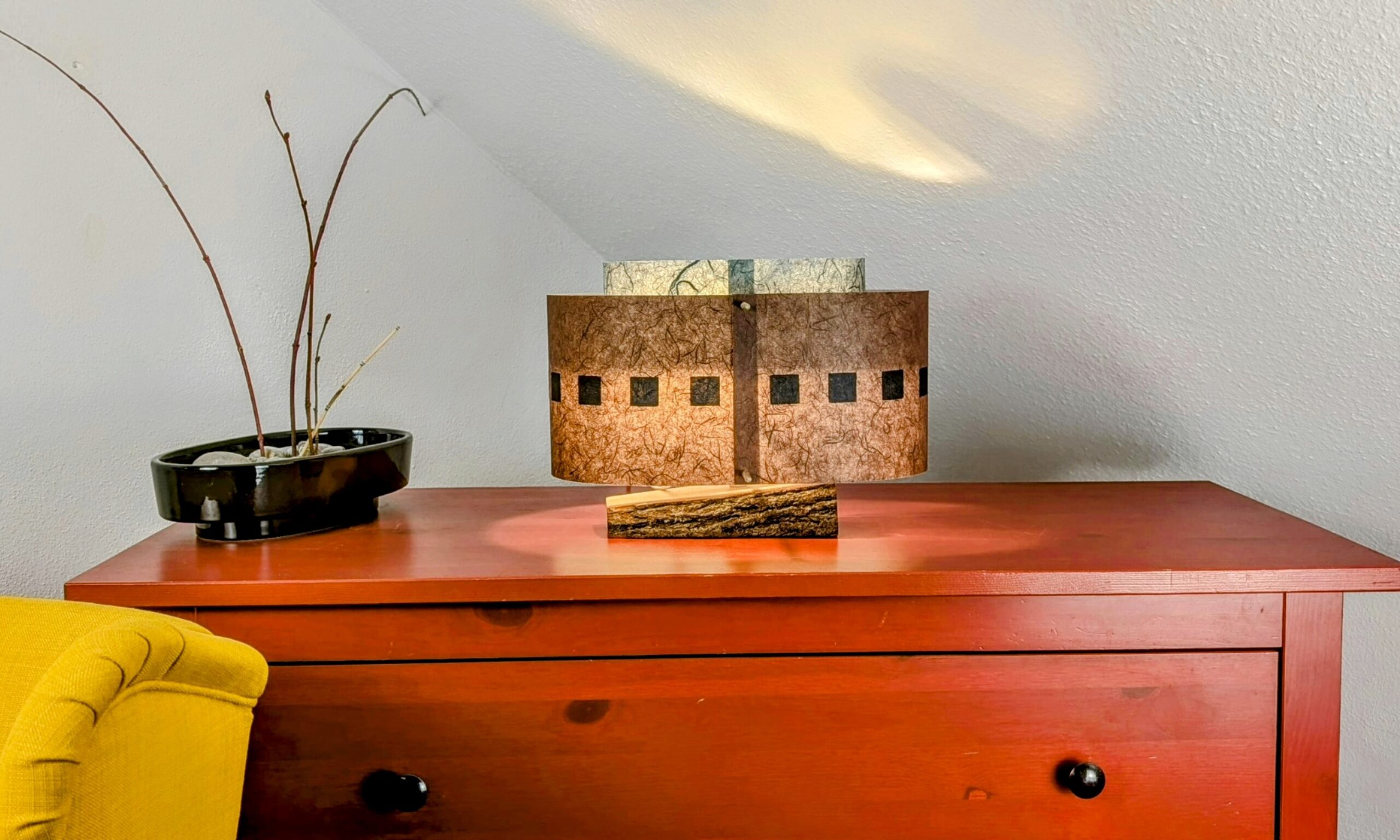 Dieser einzigartige Lampenschirm vereint natürliche Ästhetik mit modernem Stil. Der Fuß besteht aus gesammeltem Holz mit erhaltener Rinde, das jedem Raum eine warme, rustikale Note verleiht. Der schräge Kantel, das geometrische Quadratmuster auf den Papierpaneelen und die dezente gräuliche zweite Ebene setzen einen modernen Akzent und schaffen ein harmonisches Zusammenspiel von Natur und Design.