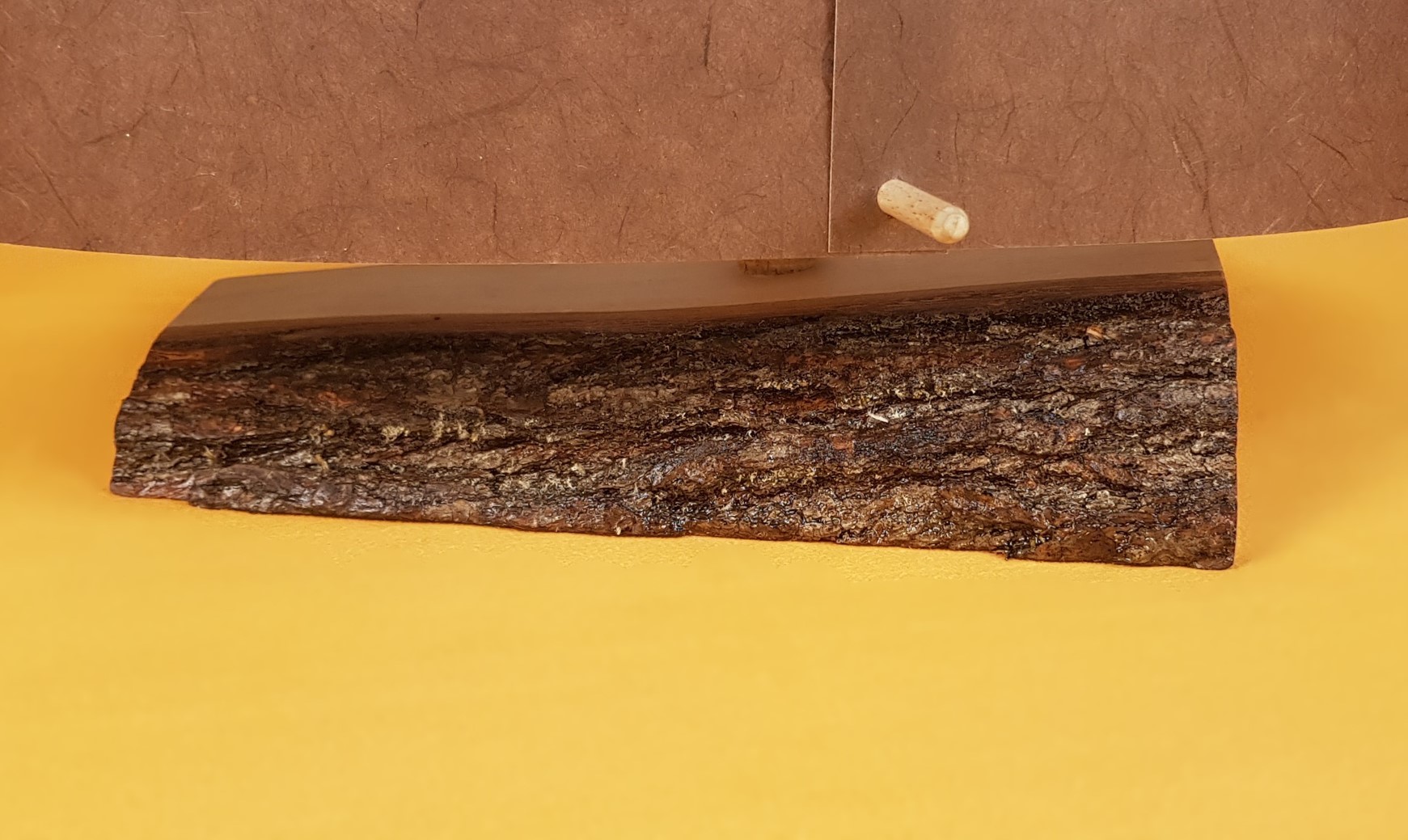 Ein natürlicher Holzfuß mit erhaltener Rinde trifft auf ein modernes Quadratmuster und eine dezente gräuliche Ebene. Perfekt für niedrige Sideboards.