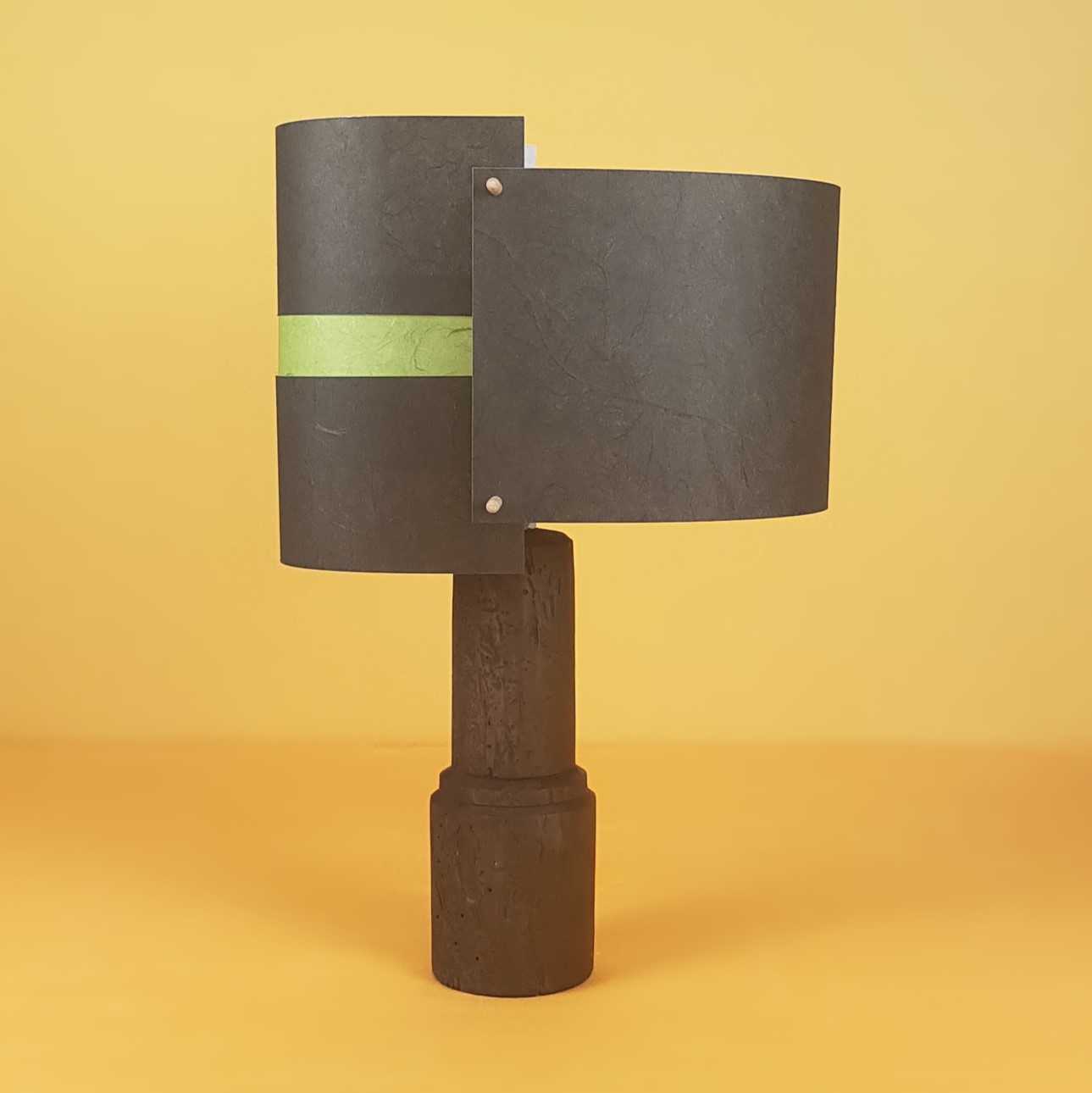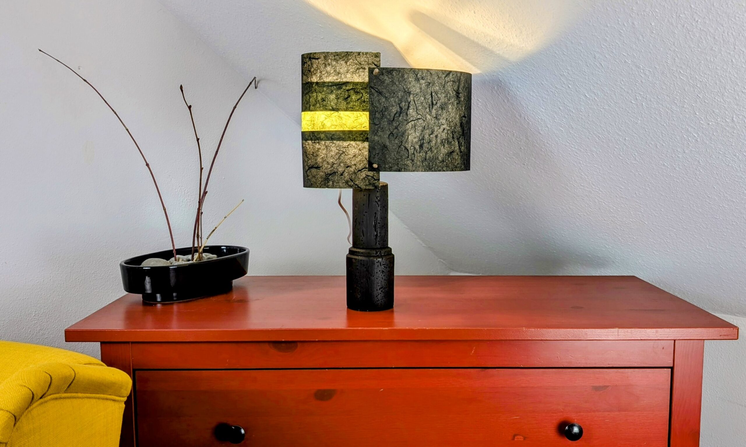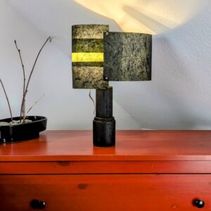 Dieser elegante Lampenschirm aus Sammelholz und schwarz-grünem Design kombiniert nachhaltige Materialien mit modernem Stil und eignet sich perfekt für größere Schreibtische oder Kommoden.